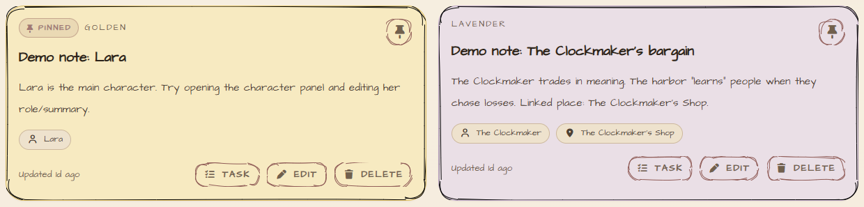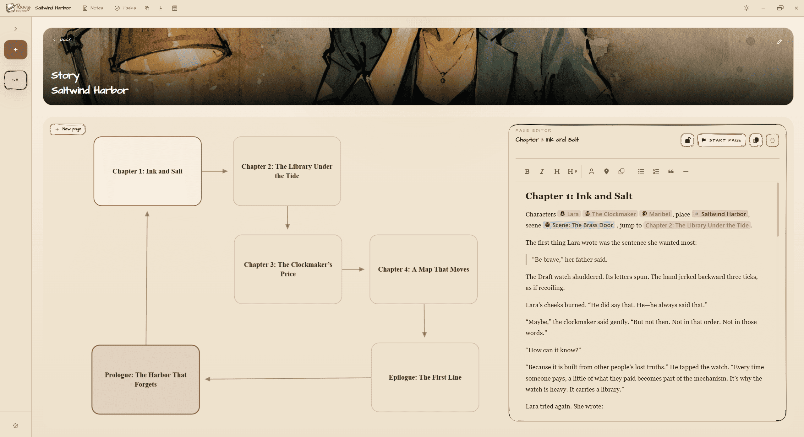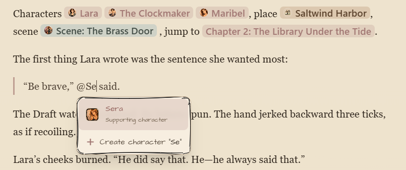 - Fast referencing while writing: mention characters, places, scenes, and story pages and get helpful hover previews.