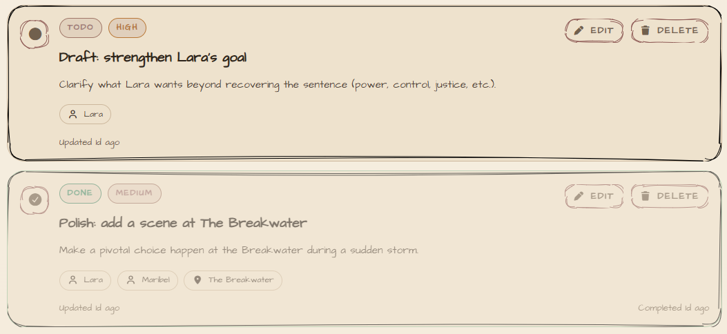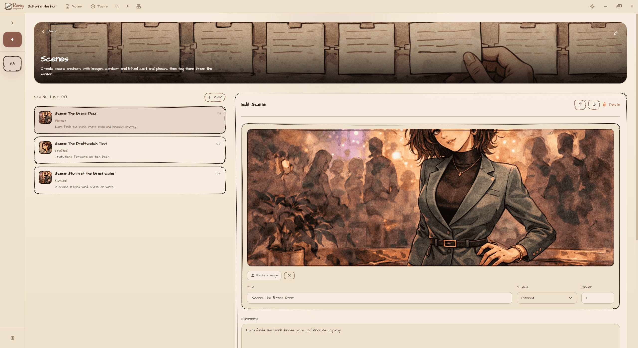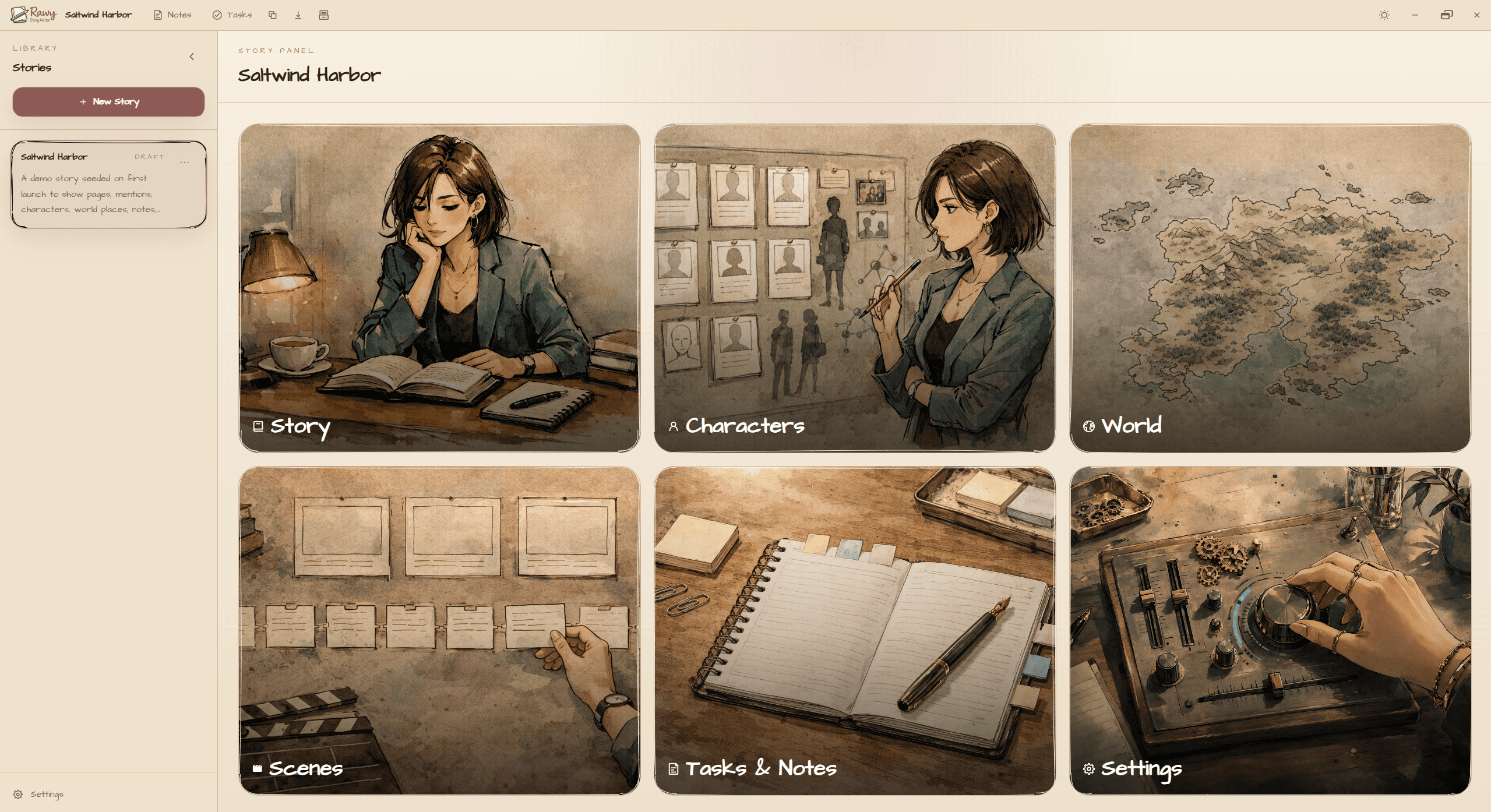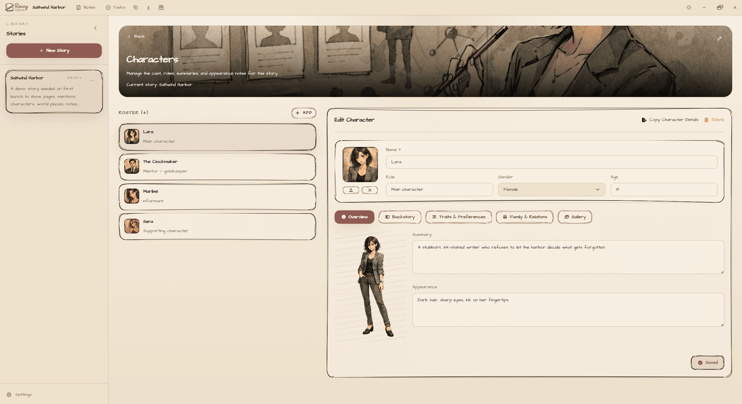 Rawy is a local-first desktop story writing tool designed for writers who want structure without losing flow. Draft your story, track scenes, develop characters, map locations, and keep notes + tasks linked to the exact things they belong to (all while your work stays on your device).