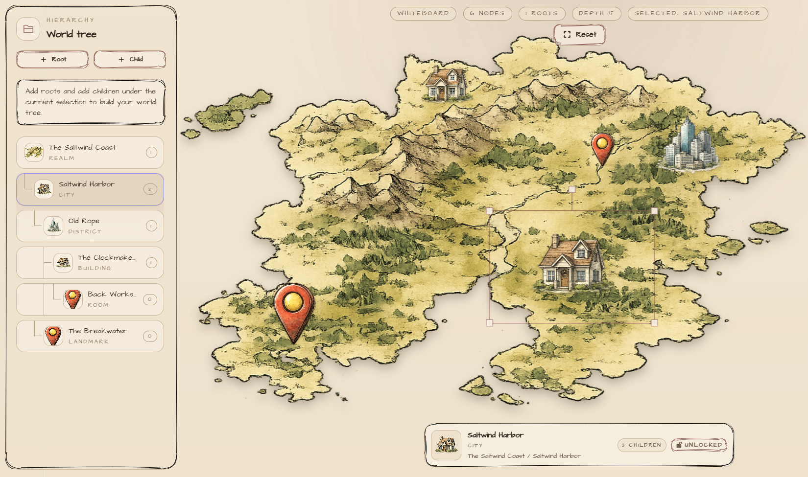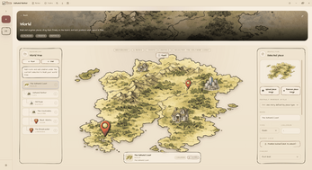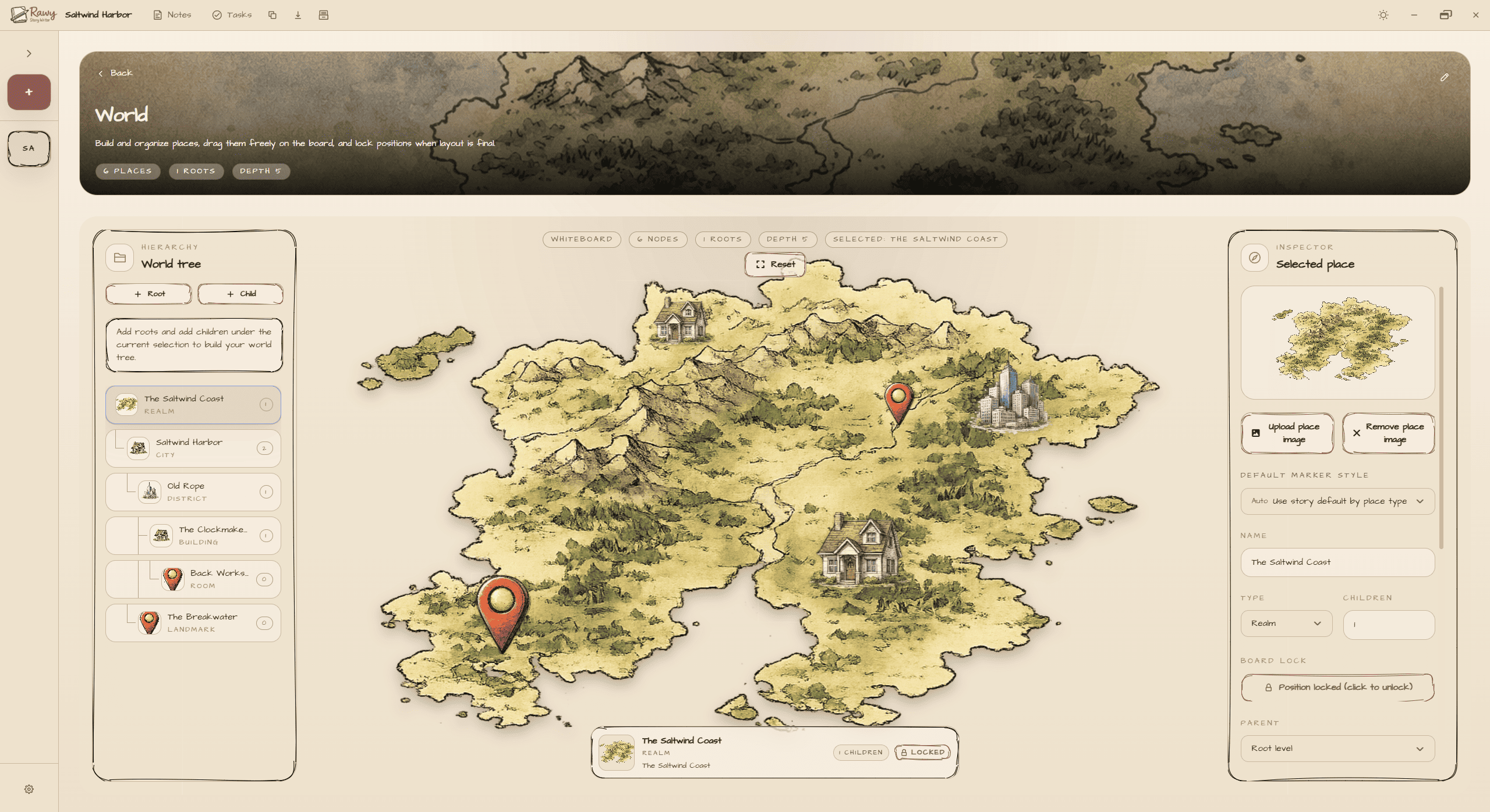 - Create places with types (realm, continent, region, city, building, room, landmark, custom).