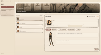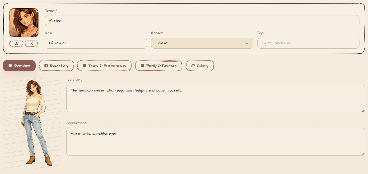 - Build character sheets: role, gender, age, summary, appearance, backstory, likes/hates, and more.
