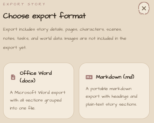 - Exports include your story overview, story pages, characters, scenes, notes, tasks, and world data.